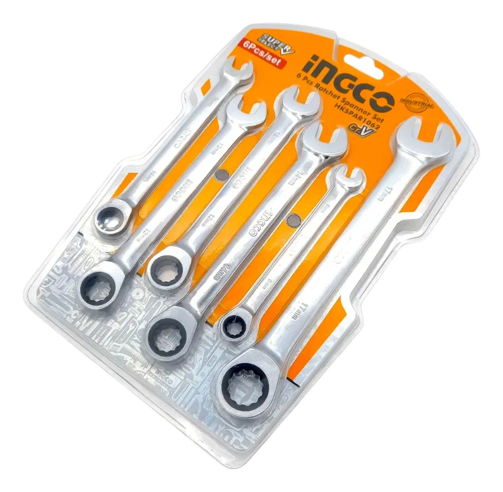 Juego de Llaves Combinadas con Criquet Ingco de 6 piezas (8-17mm). Fabricadas en acero Cromo-Vanadio (Cr-V) con acabado cromado mate antideslizante. Sistema de criquet de alta precisión para trabajos en espacios reducidos. Calidad industrial garantizada por Maxion Tools
