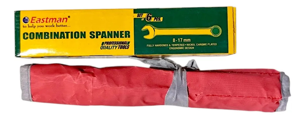 Juego de Llaves Combinadas Eastman de 6 piezas (8-17mm). Fabricadas en acero Cromo Vanadio con acabado espejo y norma DIN 3113A. Incluye estuche reforzado. Calidad industrial garantizada por Maxion Tools.